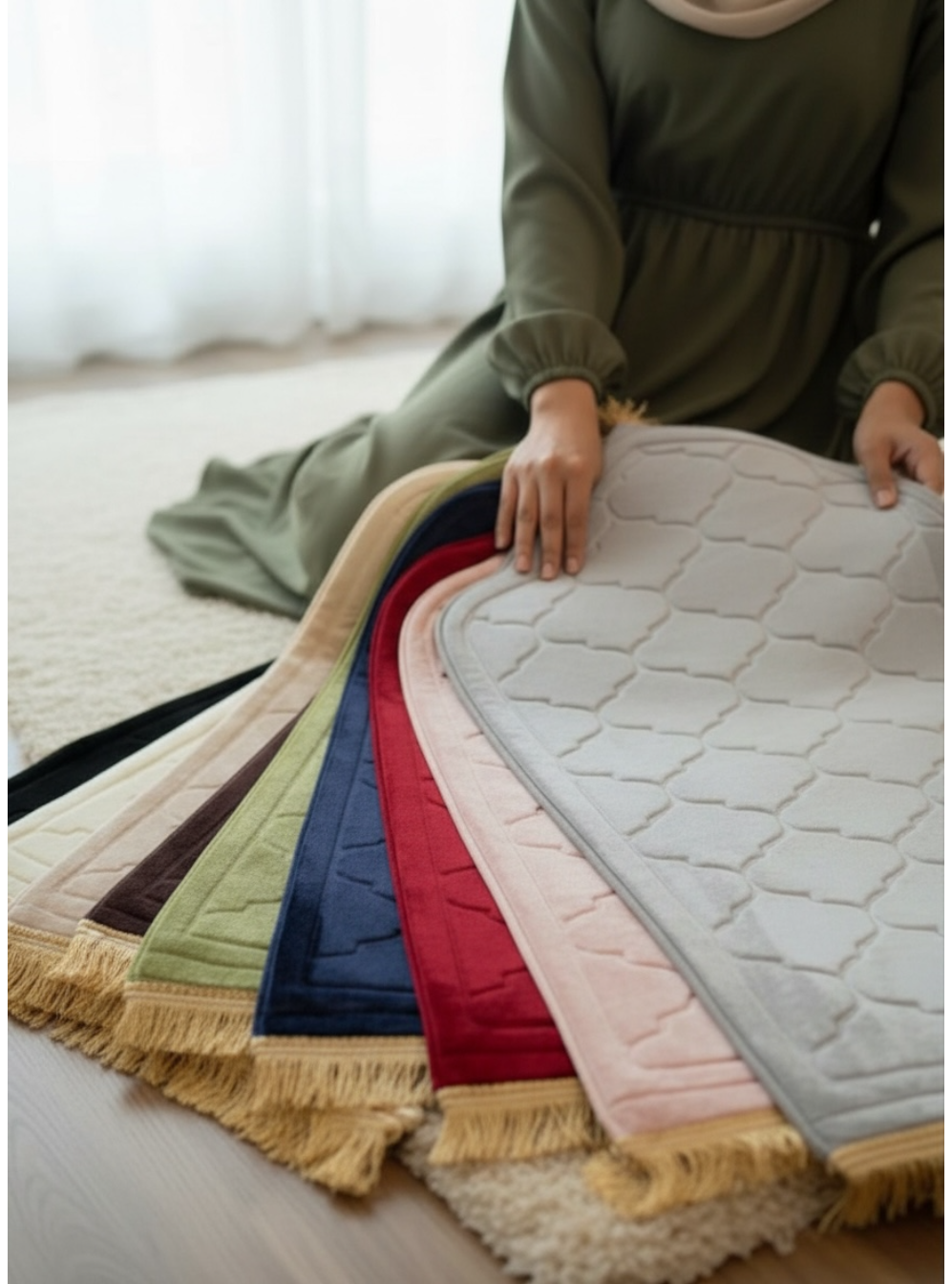 Unsere dreilagigen Teppiche sind durchdacht gestaltet: Die unterste Lage verhindert das Verrutschen, die mittlere Schicht aus Memory-Schaum schont Ihre Knie, während die samtige Oberfläche mit hoher Dichte ein luxuriöses Gefühl vermittelt. Mit großzügigen Maßen von 120 x 80 cm bieten sie ausreichend Platz. Tauchen Sie in Gebete ein, die nicht nur spirituell bereichern, sondern auch ein sinnliches Erlebnis bieten. Perfekt für Ihr Zuhause oder als liebevolles Geschenk. Beim Kauf erhalten Sie einen stilvollen Tasbeeh und einen Gebetsteppich, beide farblich abgestimmt und elegant in einer Schleife verpackt.